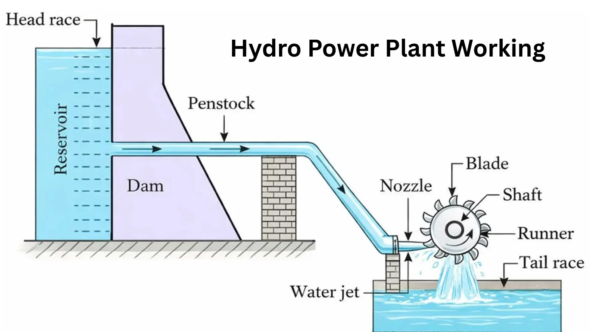 • It flows through large pipes called penstocks, which direct water to the turbine while increasing its speed and pressure.